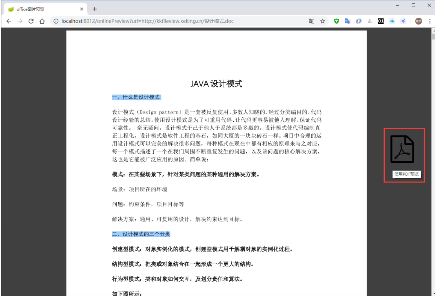 支持pdf文档预览,和word文档一样,有两种预览模式