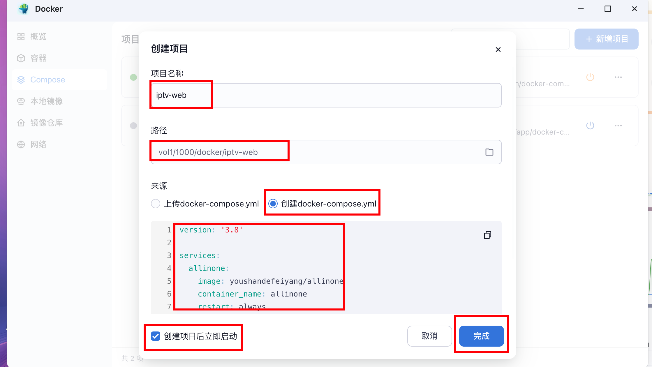 在飞牛中打开docker-compose-新增项目