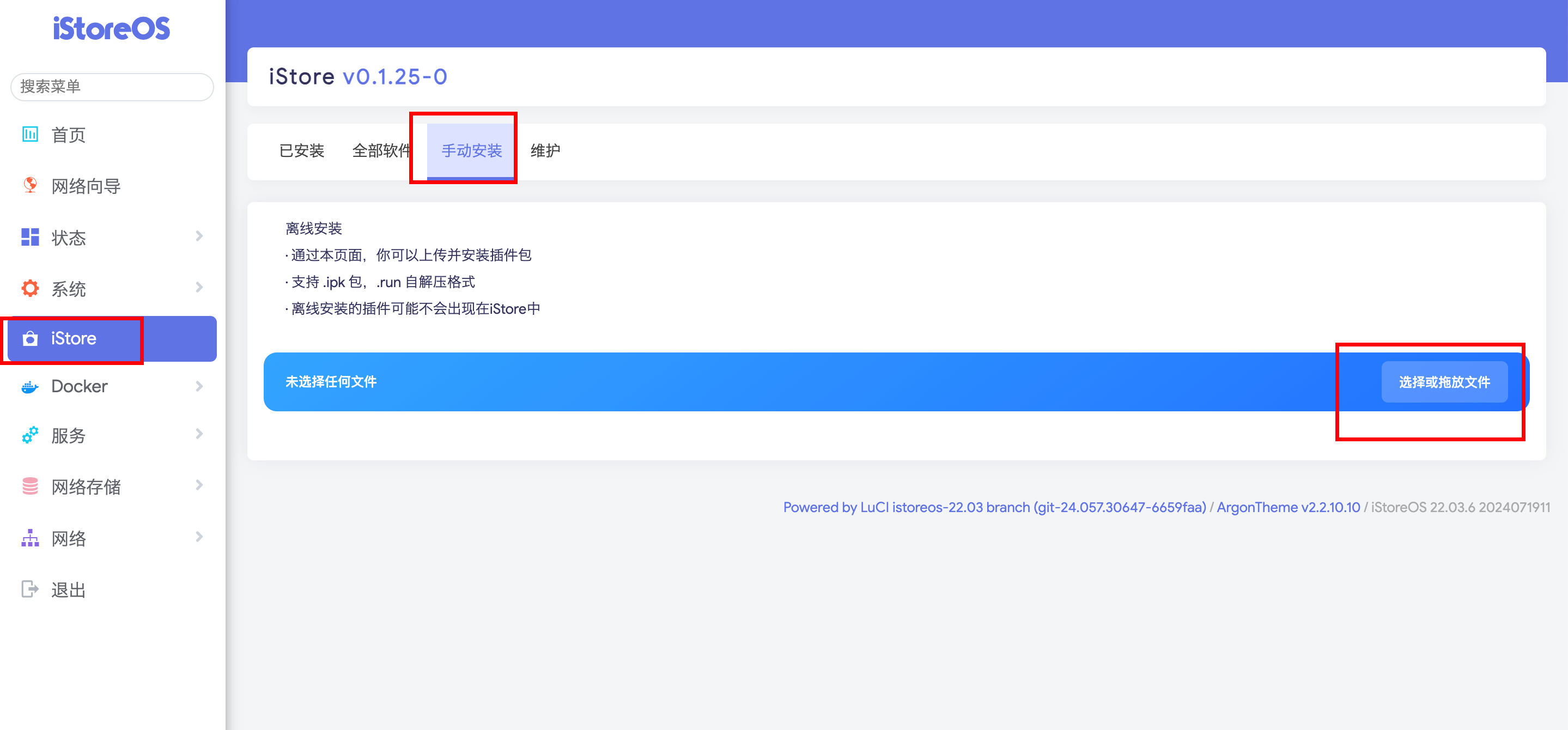 iStoreOS 还提供了软件中心:iStore (opens new window),尽可能解决插件之间的依赖关系,可让大家自由自在安装插件。手动安装离线包也是支持的。