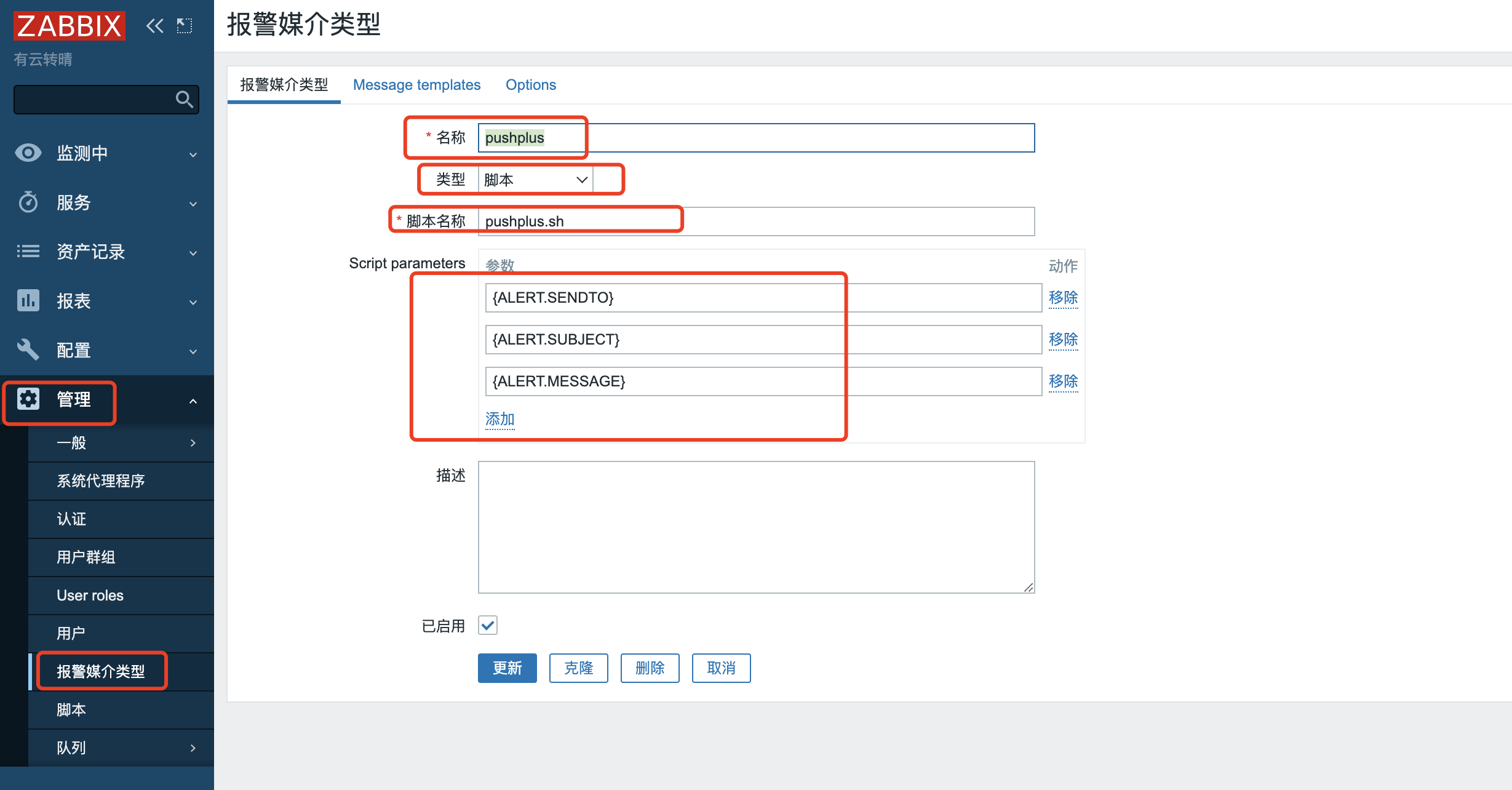 登录zabbix web端点击管理-报警媒介类型, 创建媒体类型